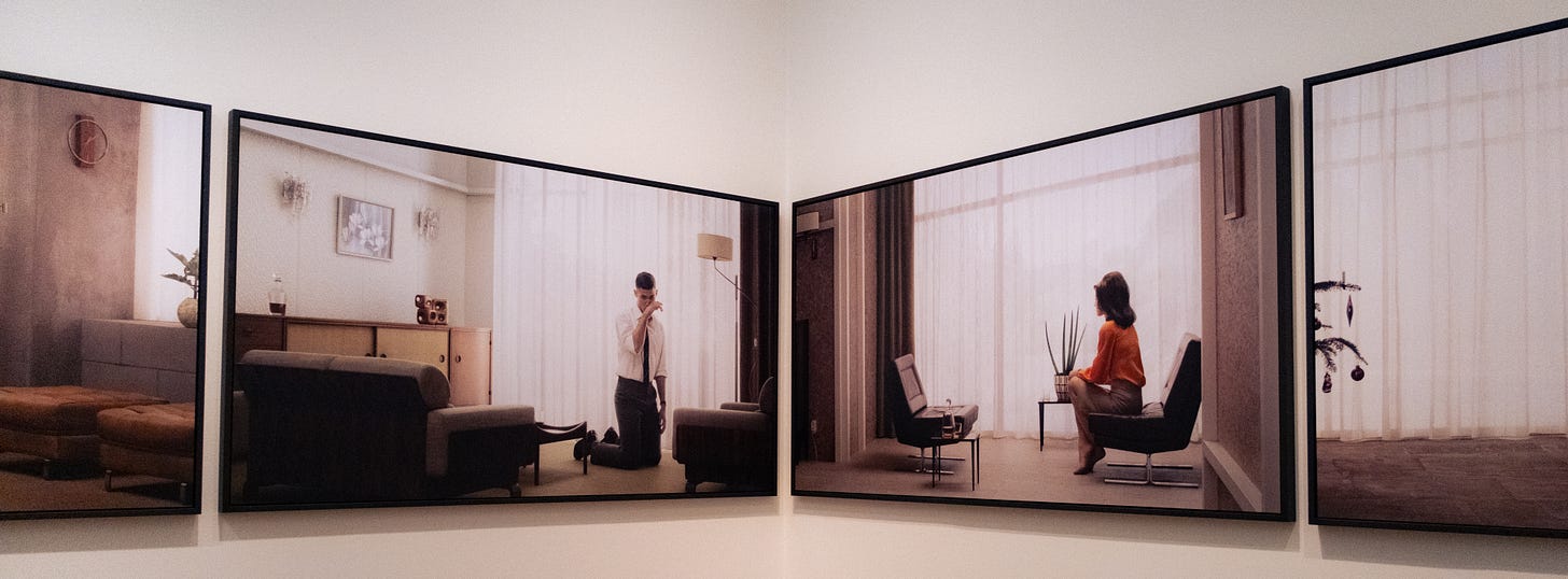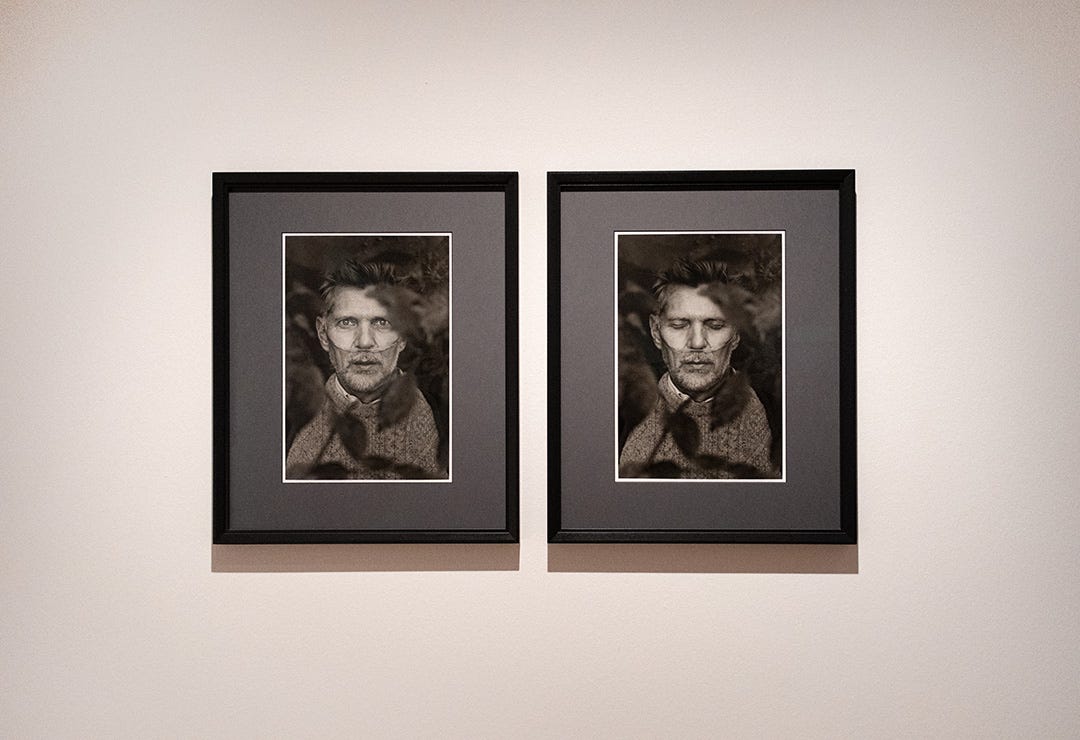Nog zo’n prachtige serie: Im Wald. Het zijn foto’s in somber zwart wit, op overweldigende formaten afgedrukt voor het Stedelijk Museum. Het portret met zijn partner Kevin ontroert meteen als je er voor staat. We zien de twee als kleine poppetjes in een donker bos staan, allebei vanaf hun rug gezien. Erwin staat met een tas in de hand, hij kijkt naar hoe Kevin met een rugtas bij hem wegloopt.